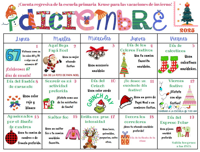 December full of dress days and a few events. Santa pictures on December 2nd and walk to school day on December 12th.